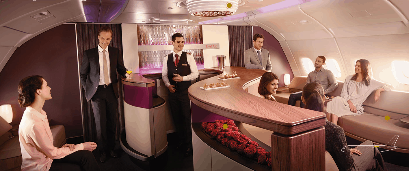 La renovada primera clase de Qatar Airways parece más un lounge que un avión. Lineas modernas y sencillas, pantallas planas con un amplio abanico de series y películas, posibilidad de convertir en cama los asientos y un barman privado que te preparará las más exclusivas bebidas mientras las disfrutas en al zona del bar.